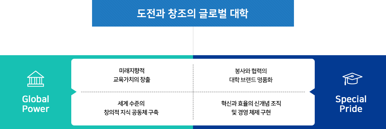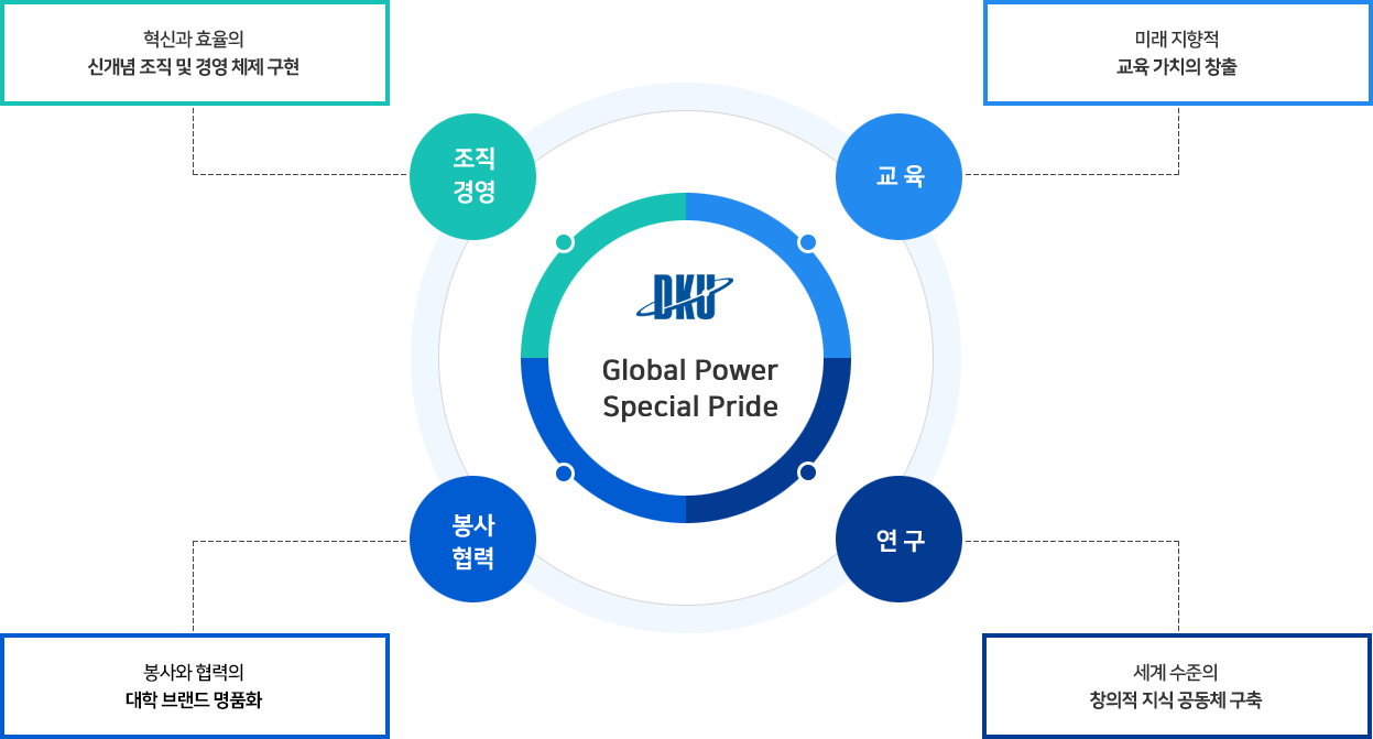 우리대학은 대학발전을 위한 4대 핵심분야(교육, 연구, 봉사·협력, 조직·경영)를 선정하고, 글로벌 경쟁력 확보와 단국브랜드 가치 창출을 목표로 우리대학의 우수 역량을 극대화하고, 실천 가능성에 무게를 둔 구체적인 발전전략을 마련하였다.