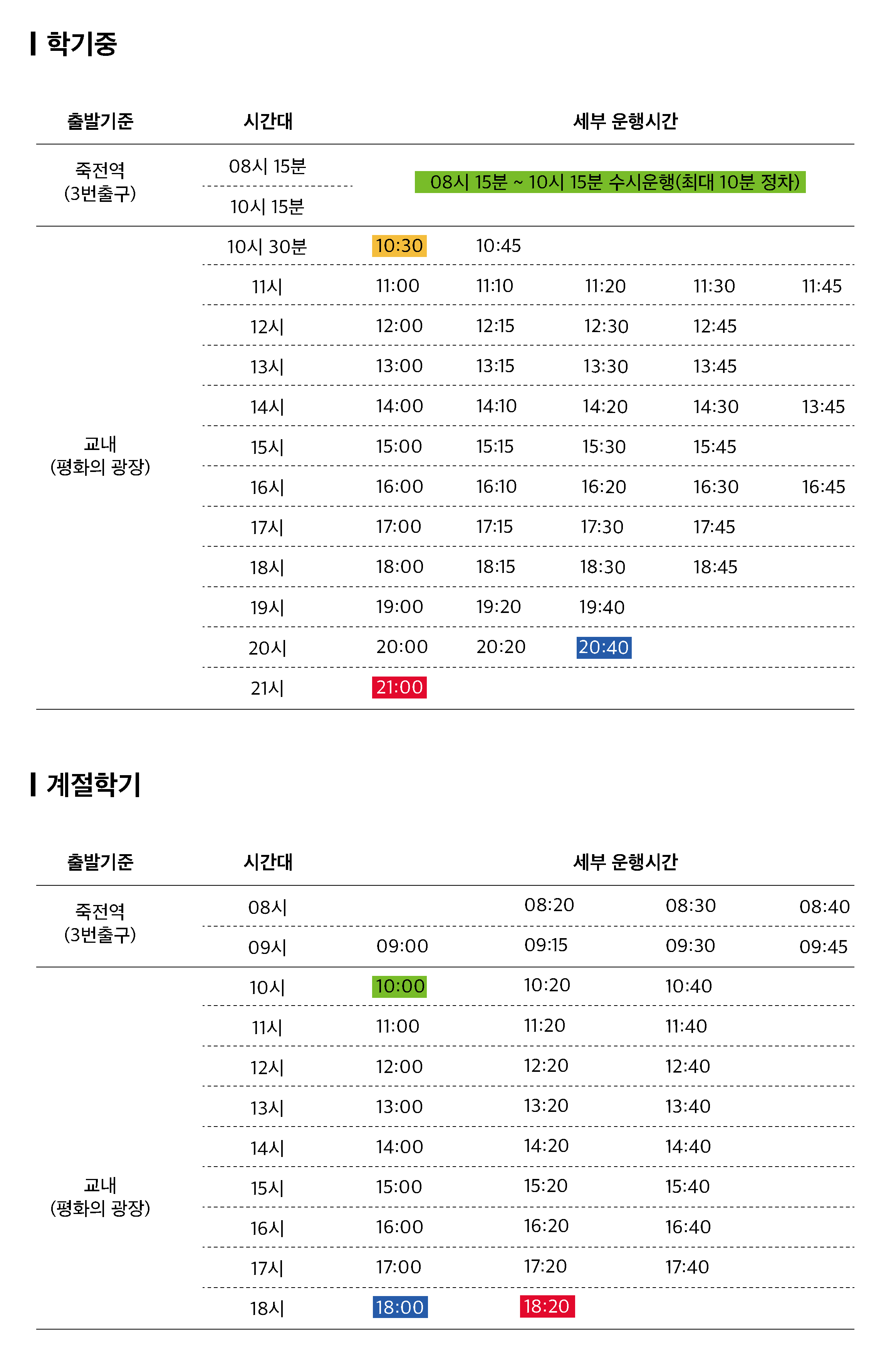 • 21:00 교내(평화의광장)에서 죽전역까지만 운행